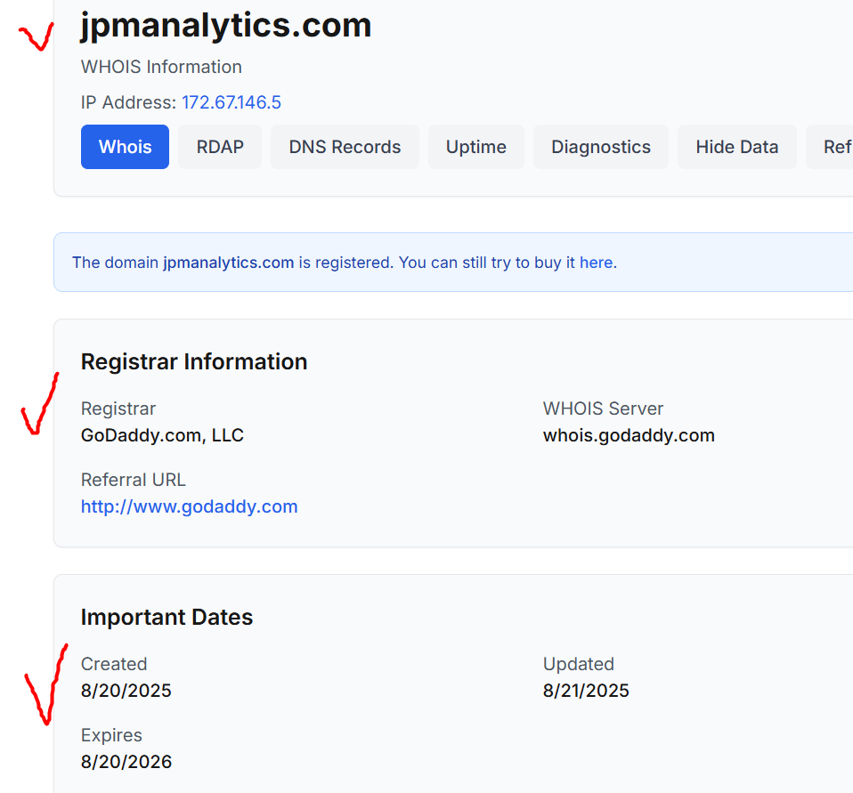 Домен jpmanalytics.com зарегистрирован всего два месяца назад — в августе 2025 года, что противоречит заявленной истории с 2013 годом. Владелец скрыт через приватный WHOIS, а регистратор — GoDaddy. Нет упоминаний о лицензиях от регуляторов вроде FCA в Великобритании или ЦБ РФ, что обязательно для легальных брокеров. Сайт полностью на русском, без английской версии, хотя штаб-квартира якобы в Лондоне. Дизайн прост, но содержание изобилует общими фразами о «надежности» и «клиентоориентированности», без конкретных доказательств. Отсутствует контактная информация: ни телефонов, ни адресов офисов, только форма обратной связи. Это классические признаки фейковых платформ, созданных для быстрого сбора средств.