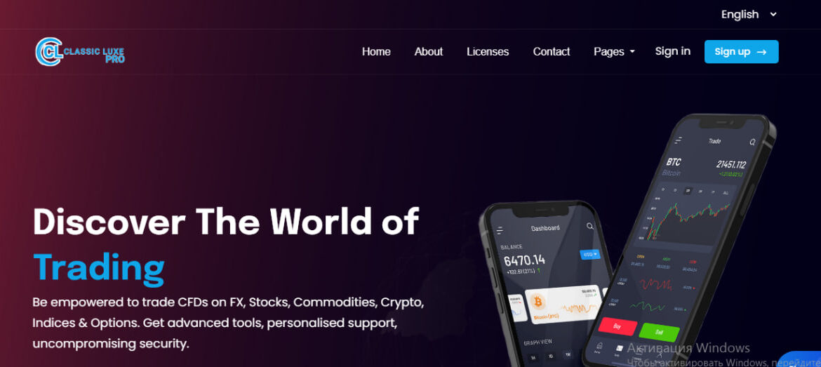 На главной странице брокера Classic Luxe Pro компания позиционирует себя как платформа для торговли контрактами на разницу (CFD) по валютным парам (FX), акциям, сырьевым товарам, криптовалютам, индексам и опционам. Компания подчёркивает наличие «продвинутых инструментов», персонализированной поддержки и «непреклонного внимания к безопасности», а также предлагает несколько типов аккаунтов с разным уровнем сервиса. Эти утверждения и перечень инструментов размещены на публичной странице брокера.